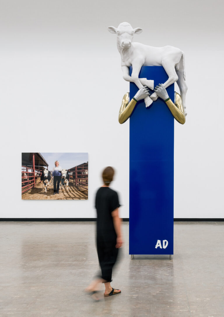 Ausstellungsansicht: Aleksandra Domanović, Bulls Without Horns: Alison With the Bulls, 2016, Calf Bearer, 2017/20, Kunsthalle Wien 2024, Courtesy die Künstlerin und Tanya Leighton, Berlin und Los Angeles, Foto: Iris Ranzinger