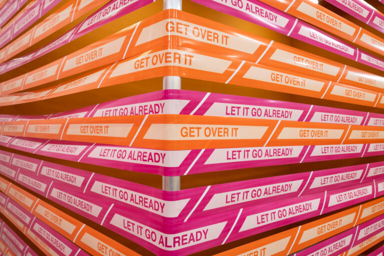 Die Scheiben undurchsichtig beklebt; der Einblick in den Innenraum abgeschirmt. Ohne viel Schnickschnack zeigt die Hülle zum Stadtraum nicht mehr als fünf Worte: „this is a love poem,.“ Die Aufschrift, dreimal wiederholt auf den Glasfenstern, tritt selbstbewusst in die umliegende Fassadenlandschaft. Dahinter liegt ein Projekt der in Großbritannien lebenden Kuratorin Cindy Sissokho, die ihre Suche nach multiplen Formen und Formensprachen in den Räumlichkeiten von Exile im Rahmen des Curated By Festivals zeigt. Der Beitrag ballt sich um politische Satire als Widerstandswerkzeug, das Untergrabung und Umdeutung mit Poetik und Performance vereint.