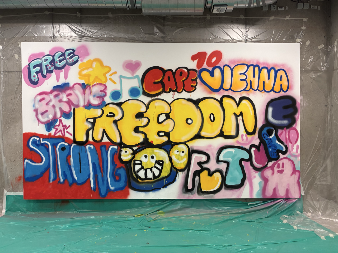 Dank der Unterstützung der Wiener Städtischen konnte die VIENNA ART WEEK heuer erneut einen Sprayworkshop für Kinder und Jugendliche realisieren. In Kooperation mit CAPE 10 – einem modernen Sozial-, Gesundheits- und Innovationszentrum im 10. Wiener Gemeindebezirk – wurde ein Aufenthaltsraum für junge Besucher:innen künstlerisch neu gestaltet.