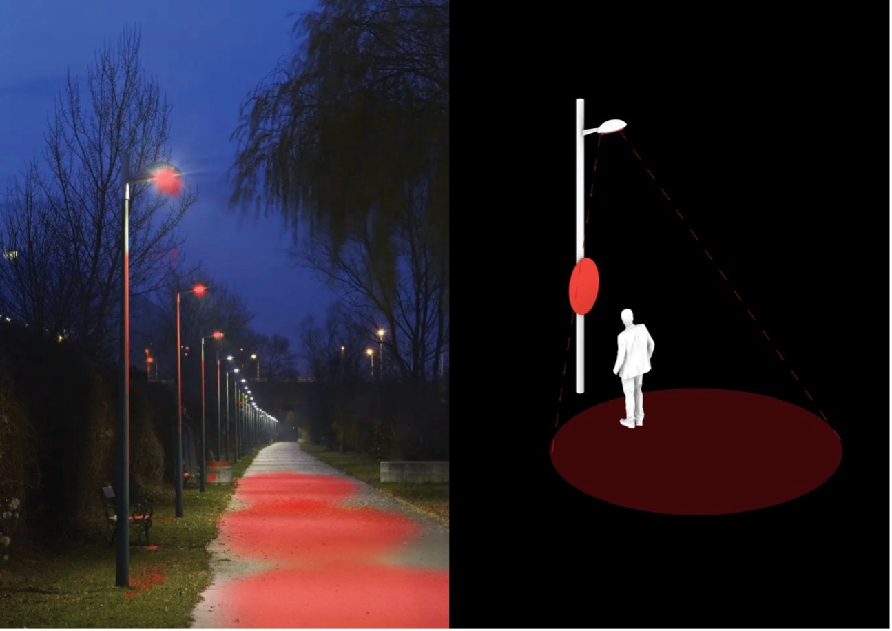 “Licht für Vielfalt” (“Light for Diversity”) by Dust Institute uses red-light filters on street lamps in Vienna’s parks to strengthen nocturnal biodiversity and demonstrate how insect-friendly lighting can work.