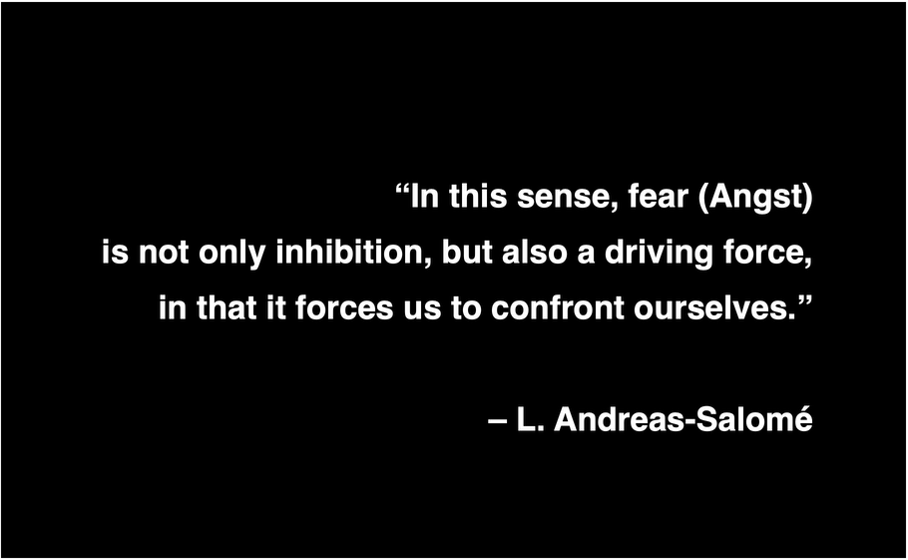 “In this sense, fear (Angst) is not only inhibition, but also a driving force, in that it forces us to confront ourselves.” (L. Andreas-Salomé)