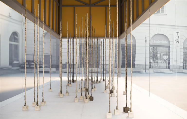 In the MQ Art Box, Sofia Goscinski has arranged her ‘Desert Plants’ – an ensemble of 48 elegant, columnar sculptures cast in concrete and partly executed in bronze. Goscinski moulded the concrete around the approximately 250 cm long iron rods with a delicate touch, leaving the traces of her hands impressively in the material. This manual process reveals itself as a concentrated, meditative act that makes the artist’s creative power visible in her direct relationship with the material.