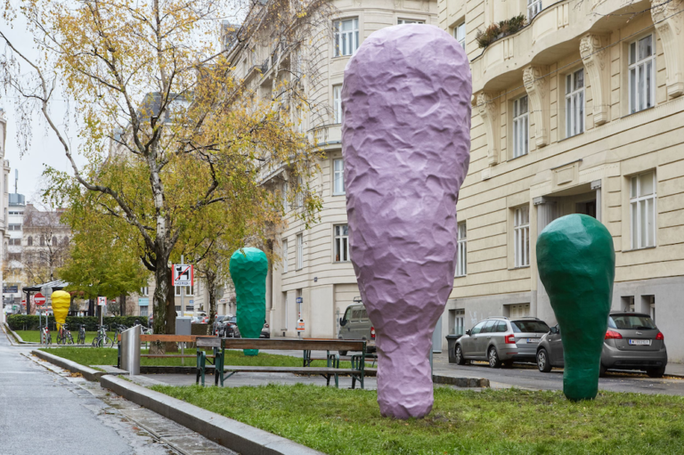 Franz West (1947-2012), one of Austria’s most internationally acclaimed artists, worked in Vienna throughout his whole life. His studios have been located in Vienna’s third district since the 1990s, most recently for many years on Esteplatz. Since 2022, one of his sculpture groups has been installed on this square – as a collaboration between the Franz West Privatstiftung and KÖR Kunst im öffentlichen Raum Wien.